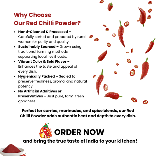 Experience the bold flavor and vibrant color of our Red Chilli Powder, sourced directly from rural Indian villages, where it is carefully cleaned and pre-processed by hand by skilled rural women. Sustainably sourced and hygienically packed, this pure and preservative-free spice brings the authentic essence of traditional Indian kitchens to your meals.