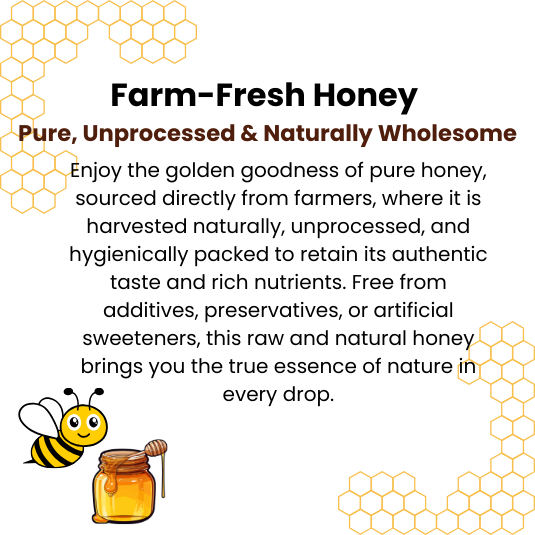 Enjoy the golden goodness of pure honey, sourced directly from farmers, where it is harvested naturally, unprocessed, and hygienically packed to retain its authentic taste and rich nutrients. Free from additives, preservatives, or artificial sweeteners, this raw and natural honey brings you the true essence of nature in every drop.