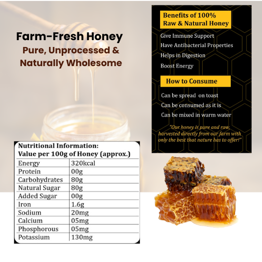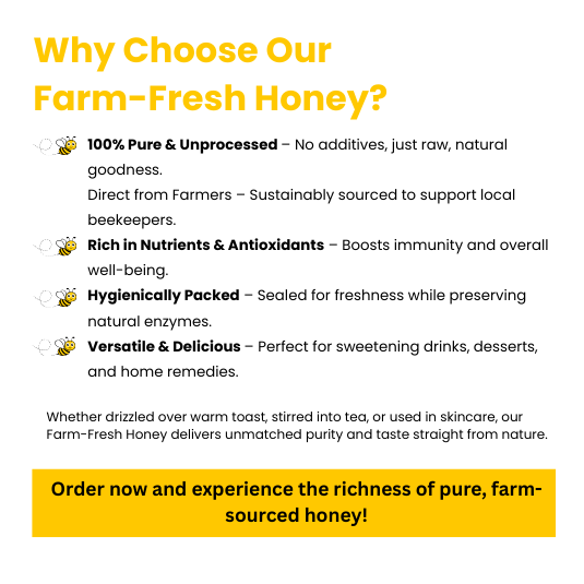 Whether drizzled over warm toast, stirred into tea, or used in skincare, our Farm-Fresh Honey delivers unmatched purity and taste straight from nature.